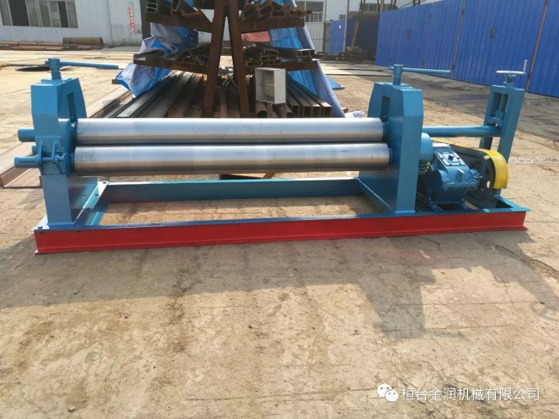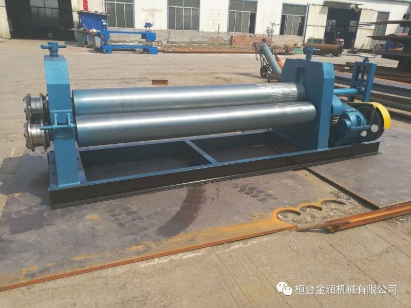 半自動(dòng)卷板機(jī),該機(jī)結(jié)構(gòu)式為三輥對(duì)稱式,上輥在兩下輥中間對(duì)稱位置作垂直升降運(yùn)動(dòng),通過(guò)人工擰動(dòng)絲桿使上輥垂直升降,兩下輥?zhàn)餍D(zhuǎn)運(yùn)動(dòng),通過(guò)減速機(jī)的輸出齒輪與下輥齒輪嚙合,為卷制板材提供扭矩。上輥可分離取料手動(dòng)升降起輥。